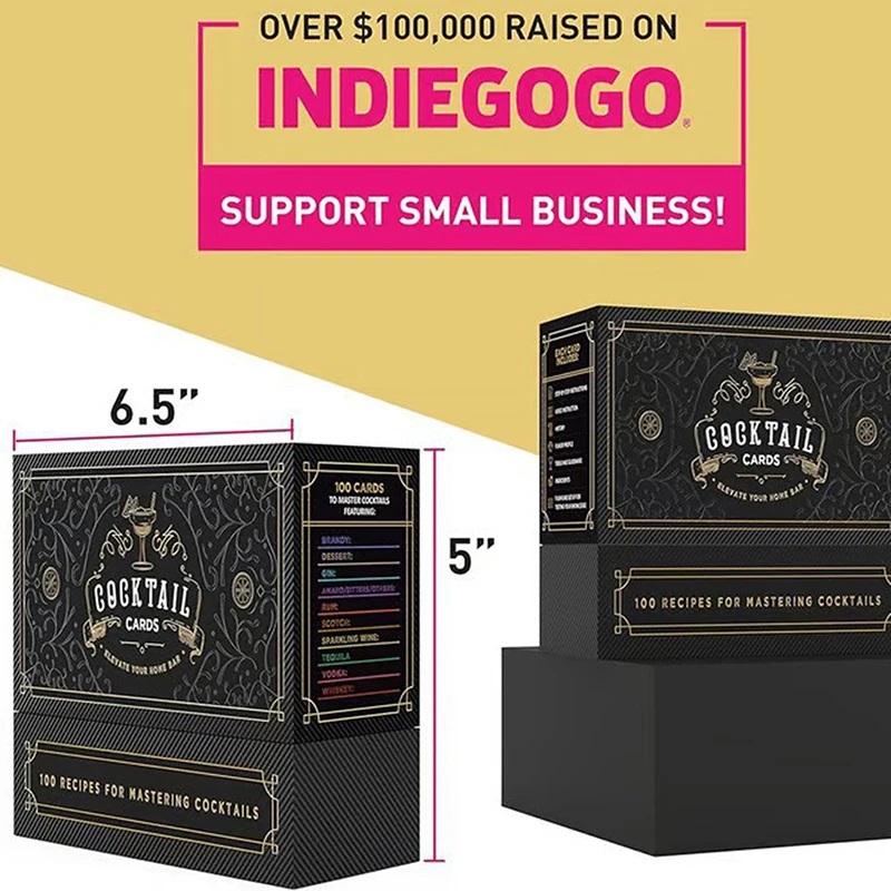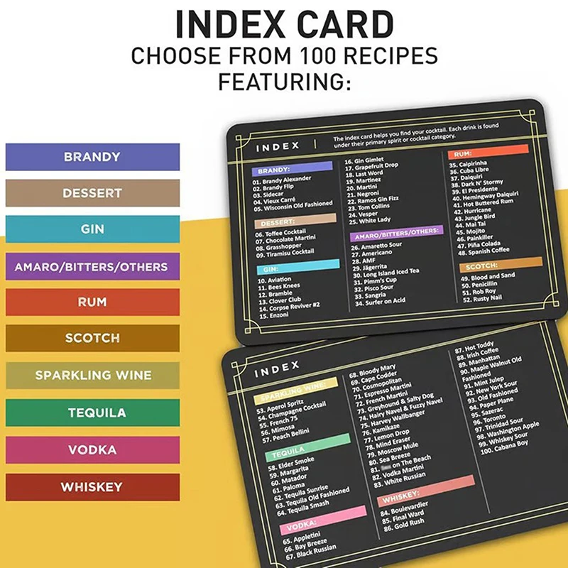 ▶️ PACKAGE INCLUDES: (103) Flashcards (6.5"x5") in size. 100 Cocktail Cards + 1 Index Card, 1 instructional card, and 1 introductory card. Box to hold the cards.