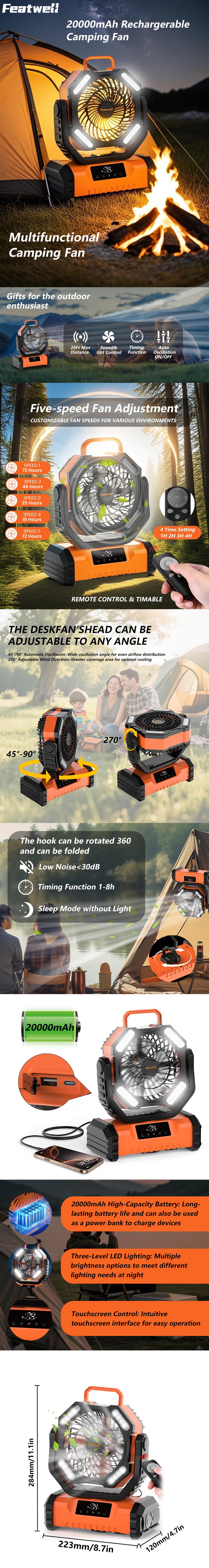 Featwell 20000Mah Rechargeable Camping Fan with LED Light, 5-Speed Fan Adjustment, Remote Control, 270° Adjustable Wind Direction, Touchscreen Interface